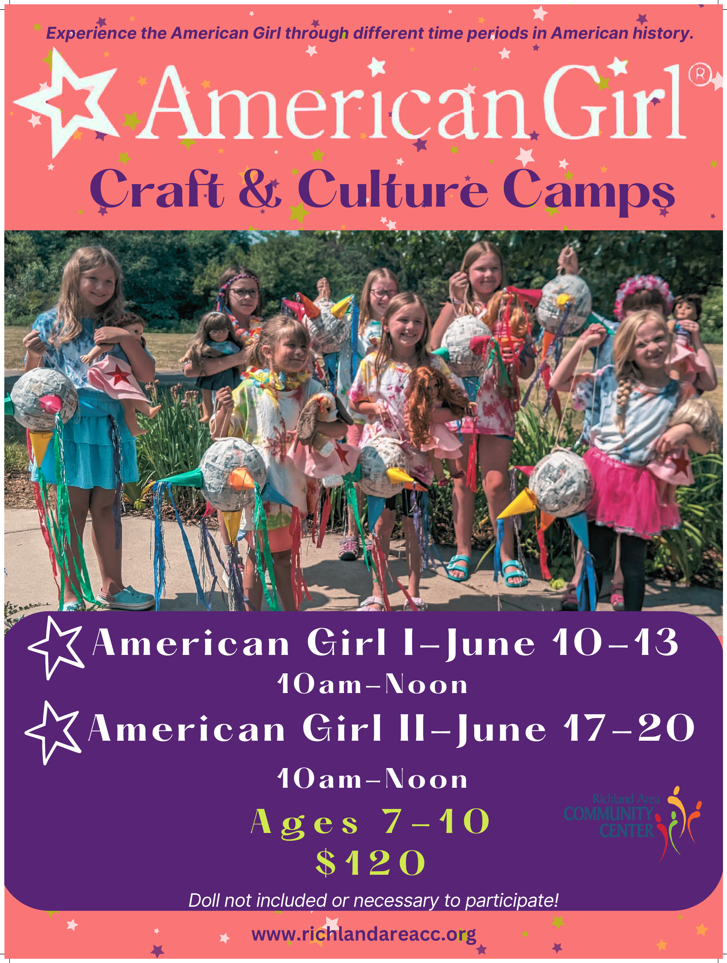 Richland Area Community Center 9400 East CD Avenue, Richland, MI, United StatesCome experience the American Girl through different time periods in American history as we bring the girls to life through crafts and projects. Some projects include doll poodle skirts with Maryellen, stuffed dolls with Addy, Hawaiian leis with Nanea and more!