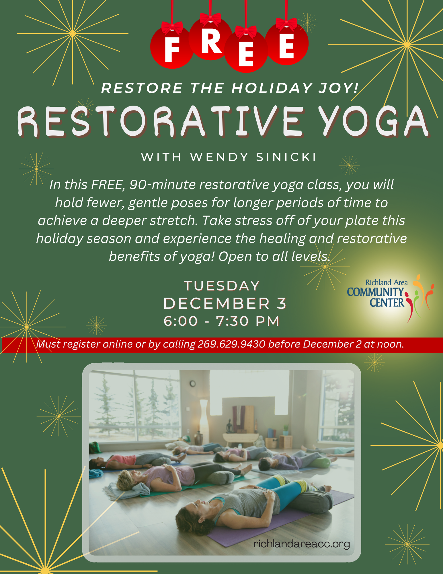 In this FREE, 90-minute restorative yoga class, you will hold fewer, gentle poses for longer periods of time to achieve a deeper stretch. Take stress off of your plate this holiday season and experience the healing benefits of yoga! Open to all levels. Registration required by December 2 at noon. You may register at the RACC during open hours. |