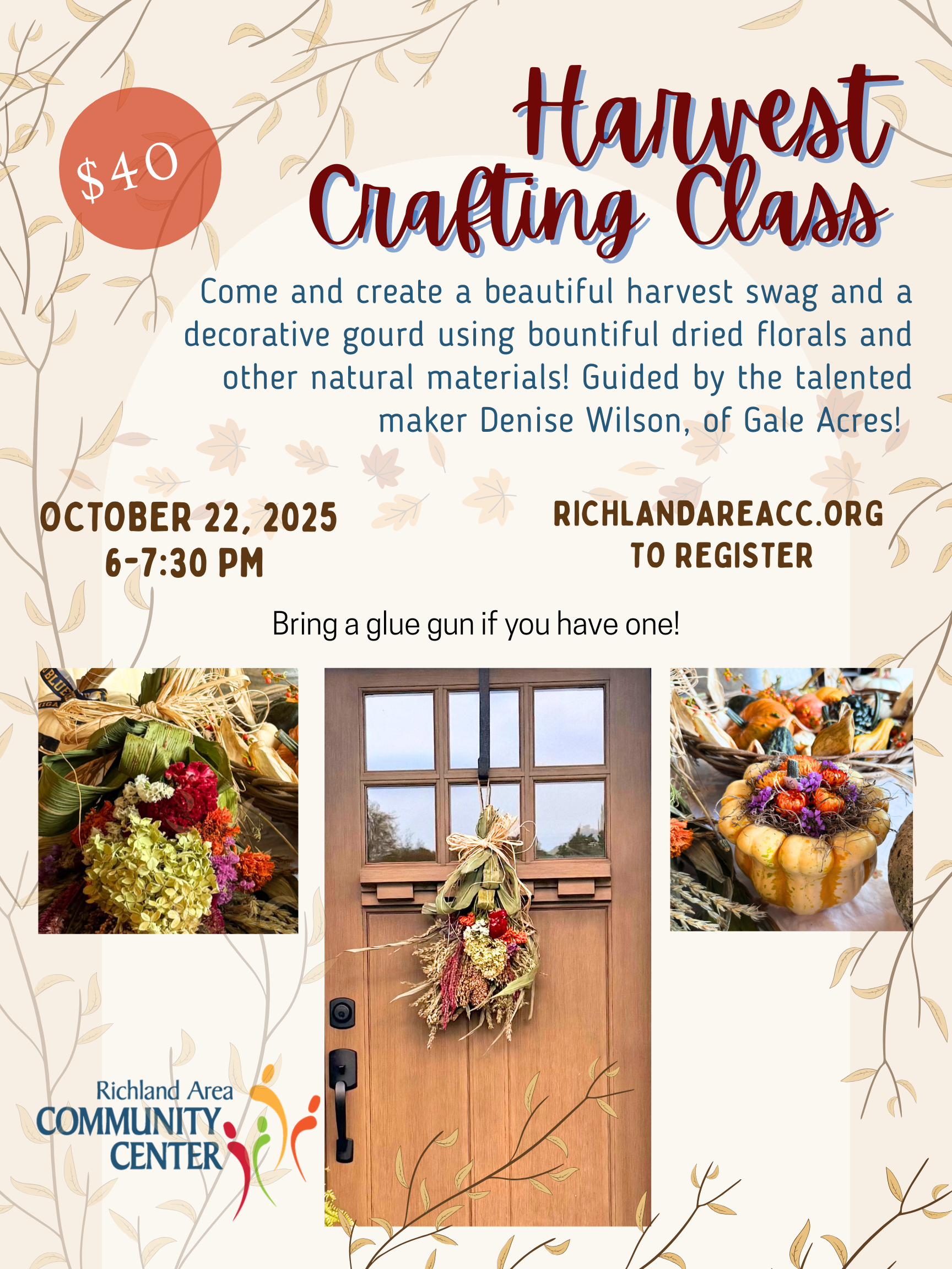 Join Denise Wilson of Gale Acre Farms on Wed, Oct. 22 (6–7:30 pm) to craft a fall swag and decorative gourd—perfect for your Harvest décor. $40 includes all materials (bring glue gun); register by Oct. 17.