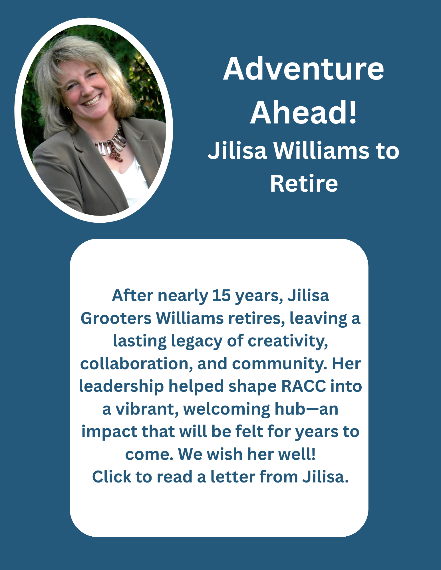 After nearly 15 years, Jilisa Grooters Williams retires, leaving a lasting legacy of creativity, collaboration, and community. Her leadership helped shape RACC into a vibrant, welcoming hub—an impact that will be felt for years to come. As we celebrate her contributions, we are now seeking our next Executive Director to lead RACC into the future.
