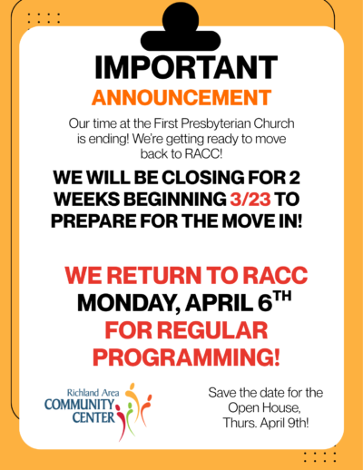 We’re excited to share that the remodeling at RACC is coming to an end, and we’re preparing to return to our newly updated space. This marks an exciting moment for our community, and we’re grateful for the support and flexibility shown during our time at First Presbyterian Church.